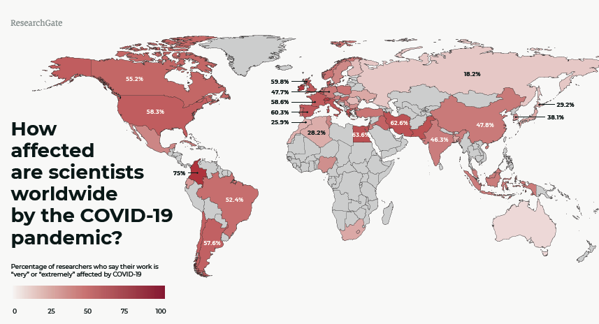ResearchGate did a survey in March to collect feedback from registered members on how the COVID-19 pandemic and social-distancing measures have affected their research. Over 3,000 responses were received within 24 hours. Among them, more than 80% report their work is being impacted by the pandemic.