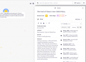 Another way to explore literature using the connections between papers is to build a map using one seed paper. For example, you may find the following article on one-child policy very useful for your research on aging population; and you are interested to capture articles that connect to it: