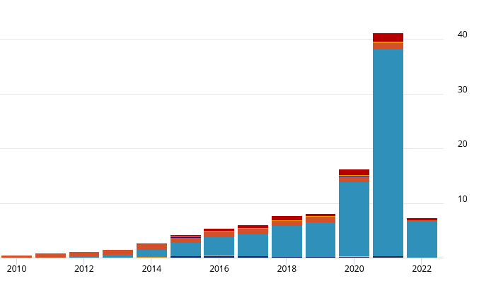 Over the years, the number of mentions of HKUST research publications have been rising (Figure 1). It doubled from 8,000 in 2019 to over 16,000 in 2020; then jumped to over 41,000 in 2021. You can see that the increase was largely driven by the blue portion, which is... Twitter!
