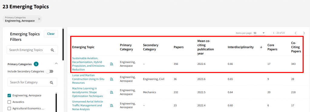 Now, select “Engineering” from the Categories in the top menu. Click on “Number of Categories” to view all sub-categories (e.g. “Engineering, Aerospace”), which currently features 23 emerging topics. Clicking on a sub-category will display the complete list of emerging topics. To dive deeper into a specific topic, click on its title (e.g. “Sustainable Aviation: Decarbonization, Hybrid Propulsion, and Emissions Reduction”).