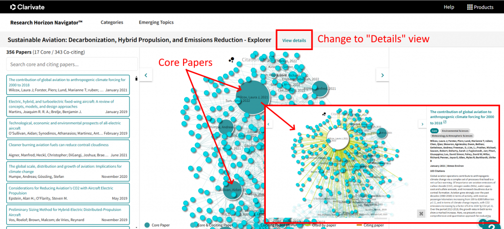 The Research Horizon Navigator provides two distinct views: Explorer and Details. The Explorer view features a network citation map, visually representing all core and co-citing papers that related to that emerging topic. Core papers are those ranked in the top 1% by citations received in the same field, publication year, and document type published within the past 5 years.