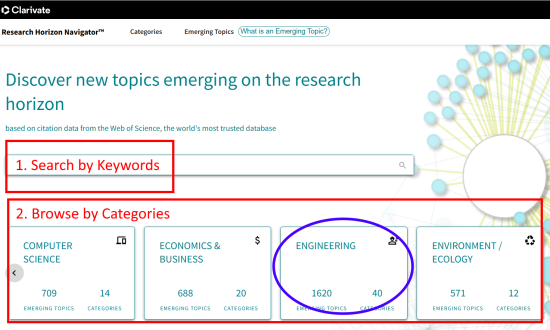 There are 2 ways to explore emerging topics in Research Horizon Navigator: by keywords or by categories (e.g. Engineering).