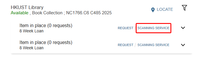 Now, when you search for local items held by our library, a new option labeled “Scanning Service” appears next to the "Request" button.