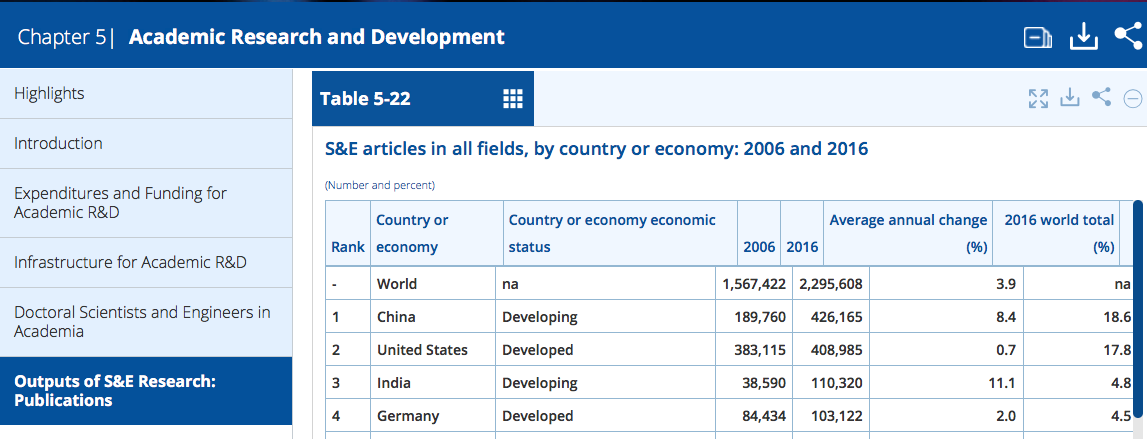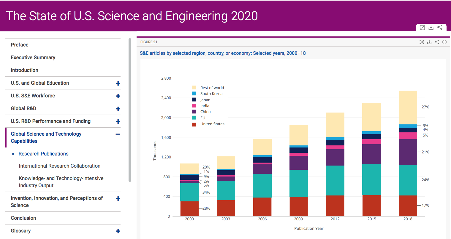 For the first time, NSF S&E Indicator 2018 report showed that China has overtaken the U.S. in the total number of S&E research publications in 2016. The State of U.S. Science and Engineering 2020 report reveals an even bigger gap.
