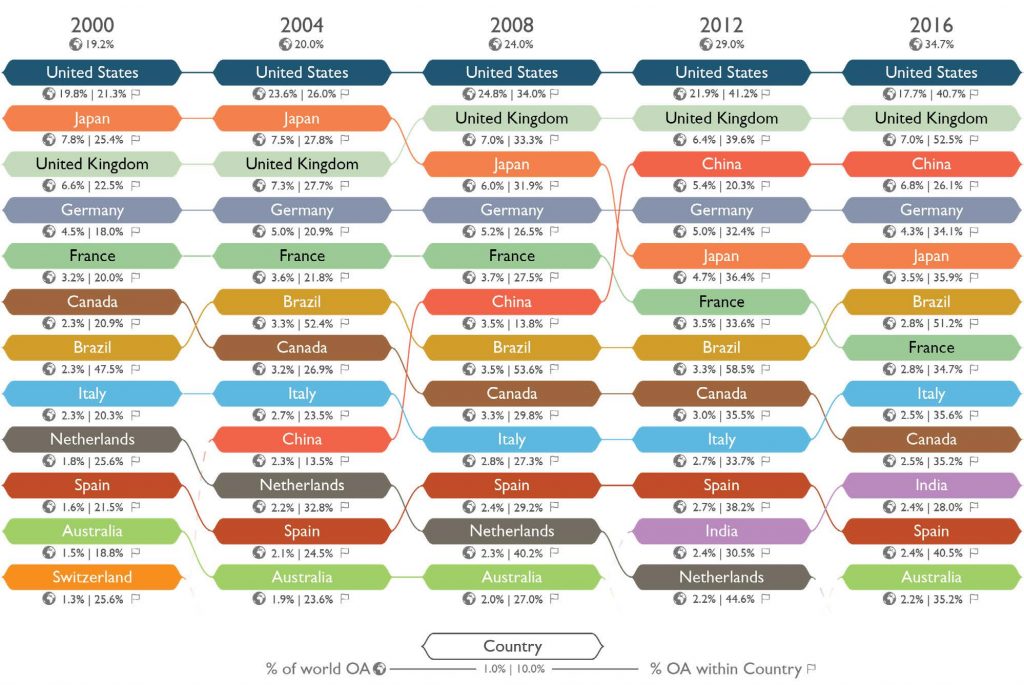 A recent study analyzed open access trends between 2000 and 2016 using publication data in the database Dimensions. The report, The Ascent of Open Access, shows an interesting picture of the top research countries over the years, and illustrates the advantage that Open Access creates.