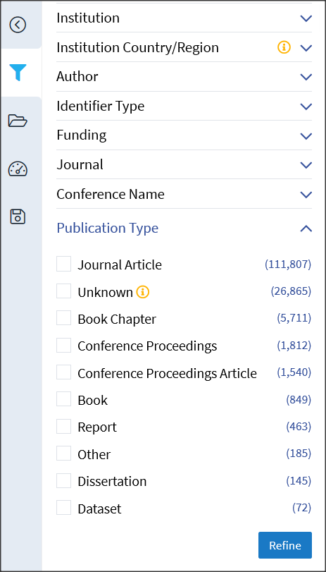 As we saw in the previous example, the search for “wastewater treatment” finds almost 150,000 scholarly works. The filtering options on the left panel help you explore different aspects of the result set, such as publication types, fields of study, journals and conference names. You can then have a better picture of the research work in this topic.