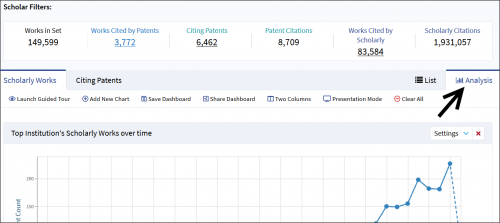 Lens automatically presents charts showing different details of the result list. Click the “Analysis” tab to see ready-made charts showing the trends of publications, leading institutions in the set of scholarly work, leading authors in the field, and much more.