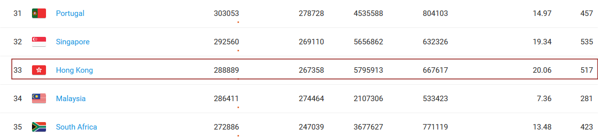 The design and functions of this interface are similar to Journal Ranks, only that it has fewer filters. Let’s see where Hong Kong is in the ranking list.