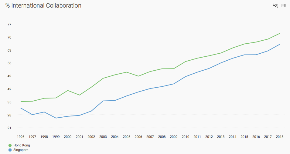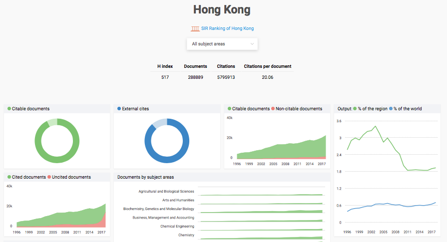 With just one click, you can find out how many papers Hong Kong has published from 1996-2018, citations per document, the H Index and world ranking.