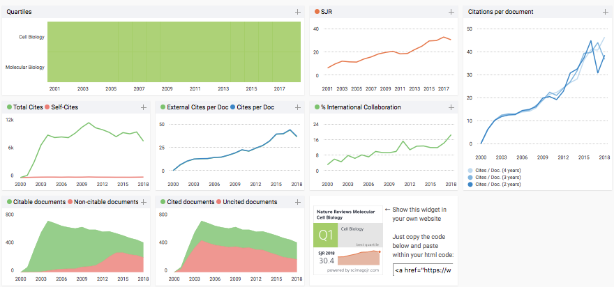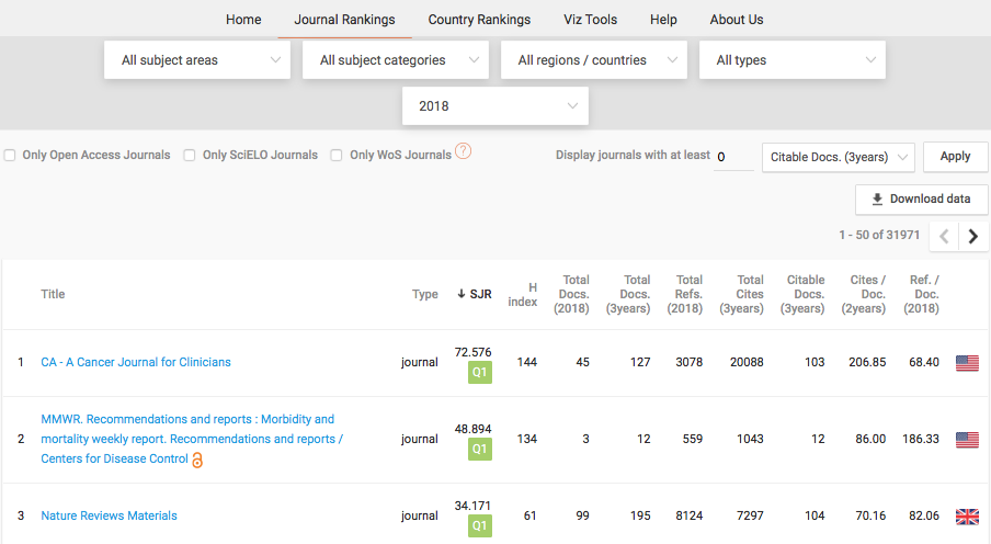 SCImago Journal & Country Rank (SCImago) is built on data from the Scopus database. It covers over 30,000 journal titles and 239 countries. Each journal and country have a separate profile with data analysis charts. The user interface of SCImago is simple and user-friendly. Simple as SCImago may look, it provides a wide range of indicators and readily available analytics data.