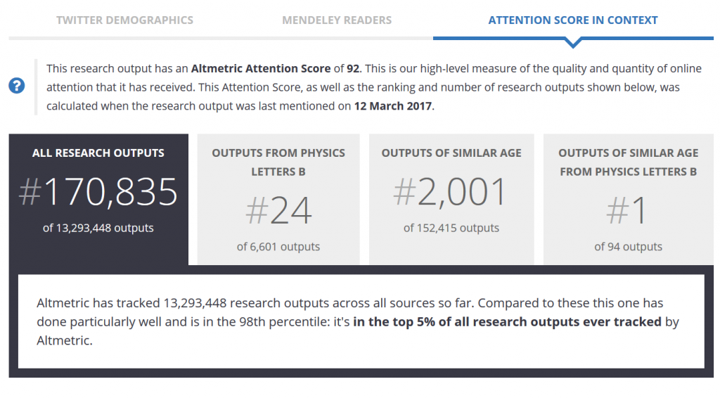 For this article “Evidence for the spin-0 nature of the Higgs boson using ATLAS data”, Altmetric calculated an attention score of 92 (as of August 2019); the article appeared in over 100 tweets and 3 Facebook pages.