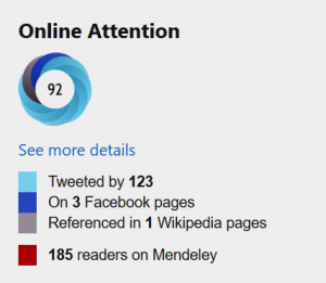 There are a wide range of social media activities that can be captured, therefore there are different “flavors” of altmetrics. One major company producing such non-traditional metrics is called, simply, Altmetric. Its algorithms compile an online attention score for each published work that has a doi (digital object identifier, a type of PID). The score and the range of metrics are presented as a badge. Here is an example: