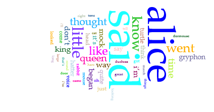 In the story of Alice’s Adventures in Wonderland, which words appear the most? When do different characters show up in the text? I uploaded the story to Voyant, using the text from Gutenberg Project. One quick glance of the word frequencies is the word cloud created by the Cirrus tool in Voyant: