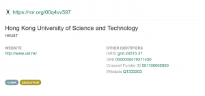 Many of us are familiar with DOIs, digitial object identifiers, that help us easily, uniquely locate research outputs. Almost all researchers at HKUST have their ORCID iDs, the identifiers that differentiate the John Chan in chemistry from the John Chan in economics. While DOIs define output of research (the "what"), ORCID iDs follow people of research (the "who"), how about the affiliated organizations (the "where")?