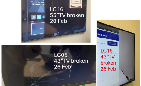 We have 13 TV monitors in the Learning Commons group study rooms, each with an HDMI cable for you to connect your laptop or tablet to facilitate discussion. Unfortunately, after the Chinese New Year holidays, 3 TVs (namely LC-05, LC-16, LC-18) were found broken within seven days (from February 20-26). Upon examination, we found that the screens had been shattered, likely due to impact from sharp or heavy objects. Such incidents are almost unprecedented in LC or Library, and the frequency of events in a short timeframe leads us to suspect deliberate acts of vandalism. We are arranging to replace the broken TVs. However, these TVs were fairly new (some only a few months old), and replacing them due to vandalism made our hearts sink. It involves not only a financial investment but also requires staff time, coordination, and construction work – and entails disposal of new equipment. It places additional strain on our staff resources and budget, and contributed to landfill pressure. Not having TVs in these study rooms until replacements can be installed also inconveniences students who have booked the rooms. Please exercise control and respect towards communal resources.